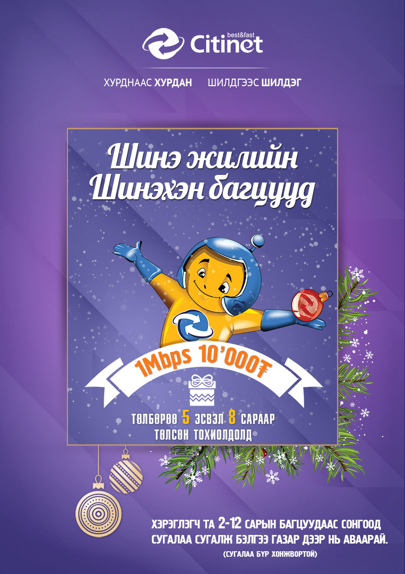 Хэрэглэгч та 1Мбит/сек ,2Мбит/сек ,3Мбит/сек ,5Мбит/сек ,10Мбит/сек хурдны 5 эсвэл 8 сарын Шинэ жилд зориулсан Шинэхэн багцуудаас сонголтоо хийж хусдаг сугалаа сугалж азаа үзээрэй. Сугалаа бүр хонжвортой.