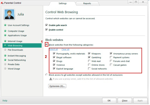 - Хэрвээ тодорхой төрлийн веб хуудсуудыг хаах бол Block websites from the following categories гэснийг сонгоно.